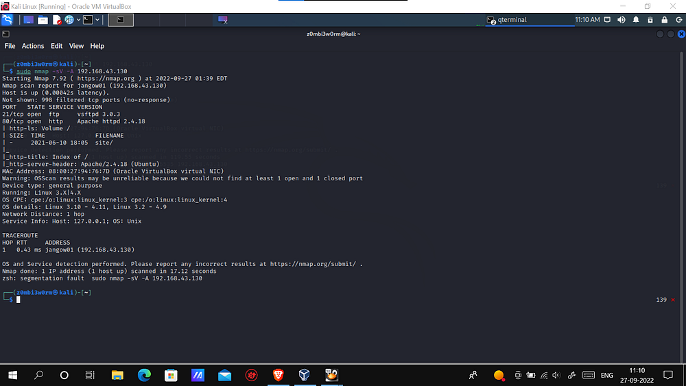 Basic reconaissance is completed. Now we got 2 open ports, FTP (21) and HTTP (80) respectively.