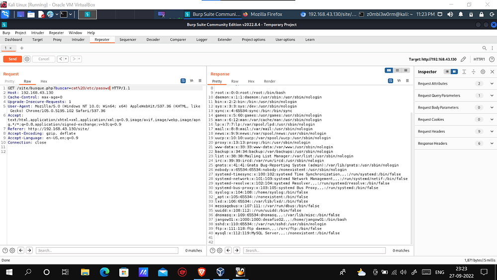 I tried the database username and password for the SSH remote login. But it wasn’t successful. So I had to do more research. Finally, I identified that the “/etc/passwd” file available. So I encoded the command and sent it.
