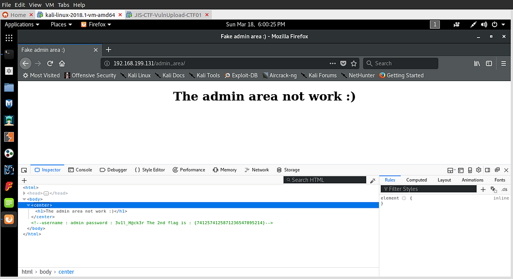 The page just displayed “The admin area not work :)” but on inspecting the page we find our 2nd flag!! commented out. There is also some login credentials.