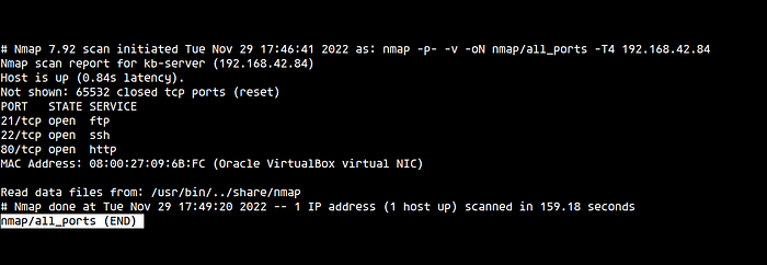 nmap -p- -v -oN nmap/all_ports -T4 192.168.42.84