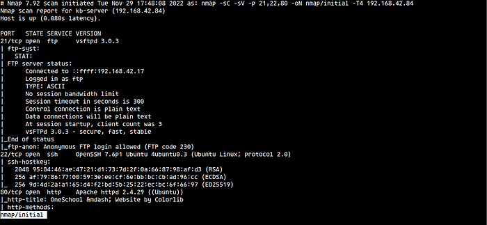 nmap -sC -sV -p 21,22,80 -oN nmap/initial -T4 192.168.42.84