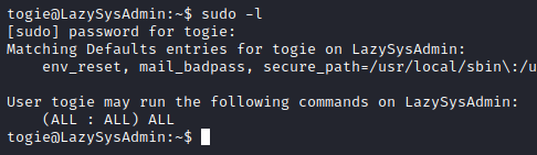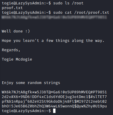 After we find that togie has “All” sudo privilges, getting the root flag is trivial.