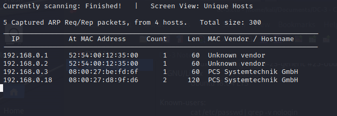 netdiscover -r <your machine ip>/CIDR blockMy Kali VM has an IP addr of 192.168.0.7/24, so I used:
