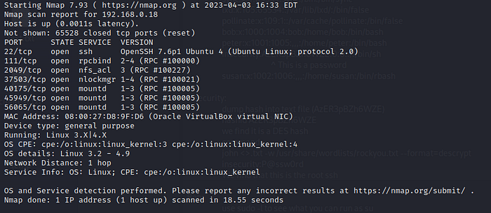 We find that the SSH port (22) and some NFS ports are open. Network File System is similar to SMB in the way that it is simply a way to share files. Let’s see if we can mount any of these shares onto our machine.