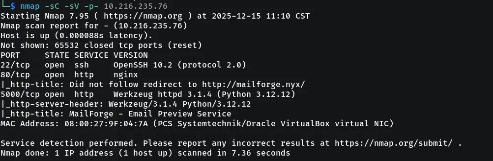 Nginx web server on port 80 (redirects to mailforge.nyx)