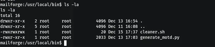 -rwxrwxrwx 1 root root 20 Dec 15 17:37 cleaner.sh`