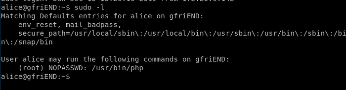 In priv esc, always try low hanging fruits first . Enumerating Alice’s sudo rights, I got my way in:-