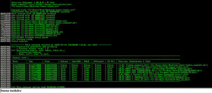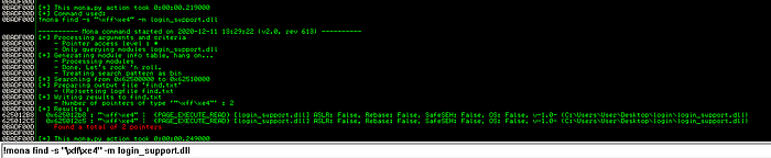 Remember login_support.dll? We can see login_support.dll has no security at all! Let’s try to find a JMP ESP address using the module, with ‘mona’ again.