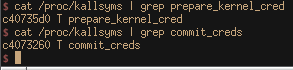 Before we can create our shellcode, we need to know the addresses of those particular functions when we execute it and while they do change each time you restart the machine, they will stay the same for every program, meaning you just need to find them once per session. Thankfully this can easily be done by grep’ing the /proc/kallsyms file for those two functions and we get their values right away.