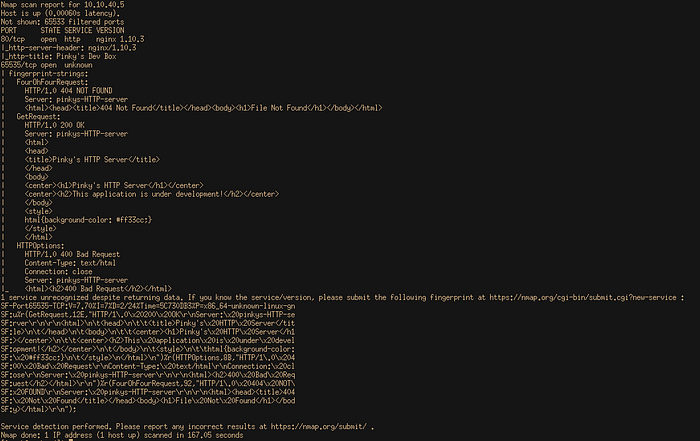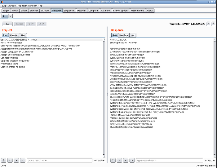 If instead, we take a look at the headers (see the above nmap results), we’ll find that the headers on the 65535 service shows the server is called “pinkys-HTTP-server” and it’s using “HTTP/1.0” instead of 1.1. Since this is an application under development, it isn’t unreasonable to think the application isn’t the website, but rather the server itself. The next task isn’t totally obvious, but if we play around with the headers inside of Burp’s repeater, we’ll notice that we can use directory traversal using “..”.