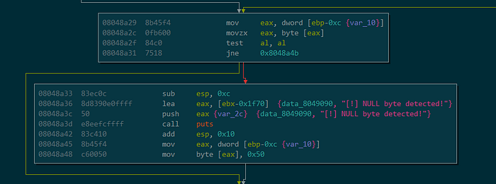 Next is because we need access to calling multiple functions, this often messes with the stack to the point where we may not be able to call everything we want. Luckily, there’s a few functions ranging from 0x8048e13 to 0x8048e2d in the program we can utilize as easy gadgets. The function addresses also contain no null characters when we put them on the stack, which is a bonus. The contents of the functions themselves do some manipulations between the registers and the stack. In particular, 0x8048e15, 0x8048e1b, 0x8048e22, and 0x8048e29 are of interest. 0x8048e15 is useful as it increments a register meaning if we play our cards right, we can bypass the null character limitation by overflowing the register from a high value to a lower one. 0x8048e1b is useful if we want to save a bunch of values to the registers and then push them back with 0x8048e22. Finally 0x8048e29 looks useful for a stack pivot.