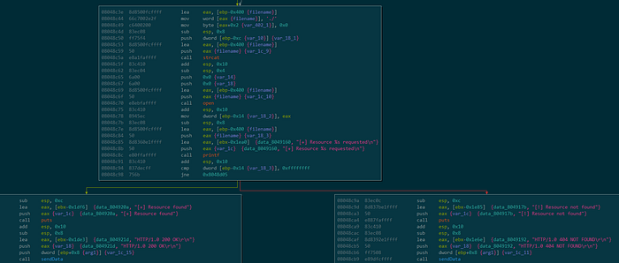 If we read further into the code, we’ll see a few useful functions: 0x8048aad handles the requests, 0x804895b sends data, and 0x80489c0 receives data.