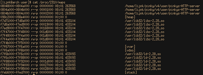 The next question is where should our stack be located. We need a place that is both readable, writeable and isn’t affected by ASLR. If we run the server and cat the maps file, we’ll see a list of suitable places: