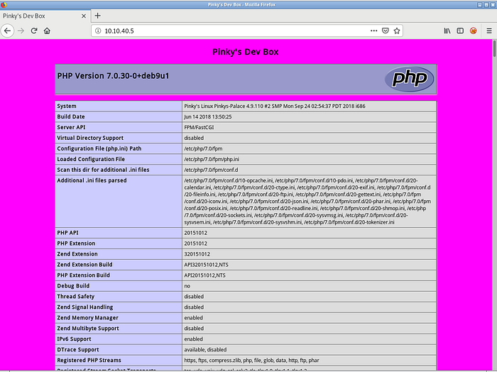 The port 80 server is just a standard nginx and if we access it, we’ll see a pink phpinfo() page.