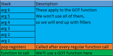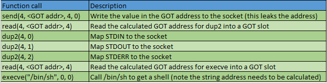 Now that we have effectively bypassed the null character filter, we can continue on and get our dup2 shell running, but we’re not over with the hurdles yet. To get our dup2 shell running, we need to appropriately overwrite our GOT entries for dup2 and execve, bypass ASLR and also set up a way to execute functions via a ROP chain without the arguments stepping over each other. The latter is easy because we can just execute the function that pops the registers off after each regular function so that we’re back in line with the next function, which will make each function will be 32 bytes long and look like the following: