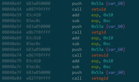 Something interesting I noticed here is if we assume this is root, the order of these ID switches is incorrect and will result in the user having uid 1338, but gid of 0. This is due to how the permissions system works when determining if you can change permissions. In Linux, there are three different IDs per user/group within a process: the effective ID, saved ID, and real ID. The real ID is the ID that was started with the process and can only be changed if the process is run as root. The effective and saved ID are used together to bounce between privileged and unprivileged users, but when coding these, you’ll only be dealing with the effective ID as the saved ID is automatically figured out behind the scenes. As for the functions, seteuid() will check if you’re root or if your real/saved UID is equal to the one you want to change to. If so, then it’ll push the current effective UID to the saved UID, then set your effective UID to the new one. The setuid() function on the other hand does the same as seteuid(), but if it switches, then it also changes your real UID meaning you cannot go back. On the other side, the setgid() and setegid() functions will do the same as their setuid() and seteuid() counterparts, but they still check the UID (GID 0 doesn’t actually mean anything special). Because of this, the program will set its RUID, SUID, and EUID to 1338, but it’ll be unable to change its GID and will thus be left alone.