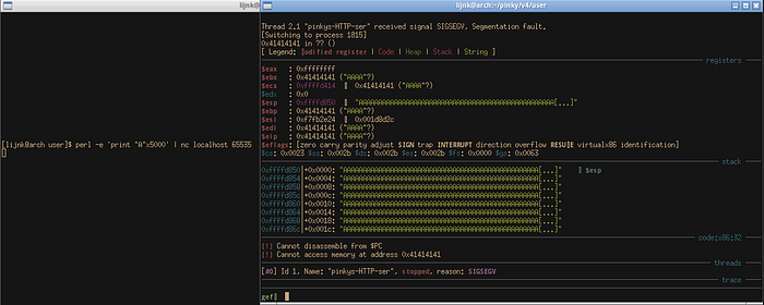Now that we know the flow of the program, we can hunt for exploits which turns out isn’t too difficult. If we take a look at the function to handle requests, we’ll see at the top, it passes a stack address into the function to receive data and at the bottom, there is no stack canary check. Putting these two together means we can control the instruction pointer, and sure enough if we send enough characters, we can achieve that.