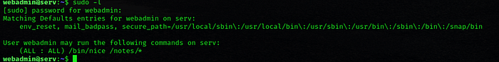 For privilege escalation we need to exploit sudo. “sudo -l ” from this command we got that we can run only “/bin/nice ” command in /notes/*” folder