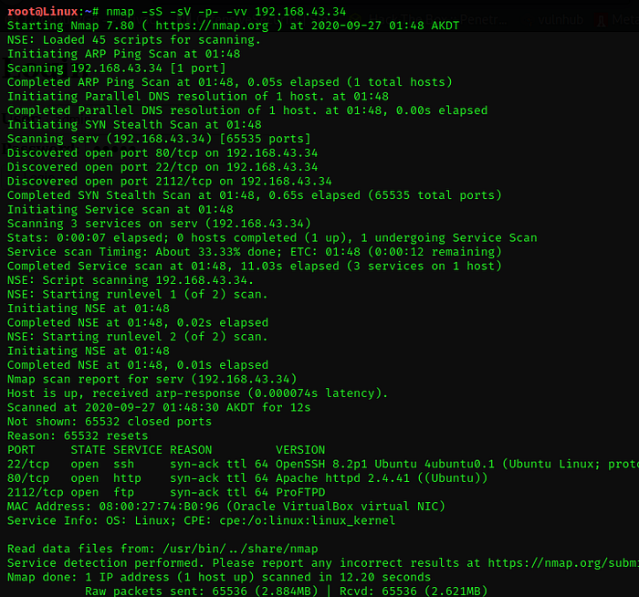 “# nmap -sS -sV -p- -vv 192.168.43.34”