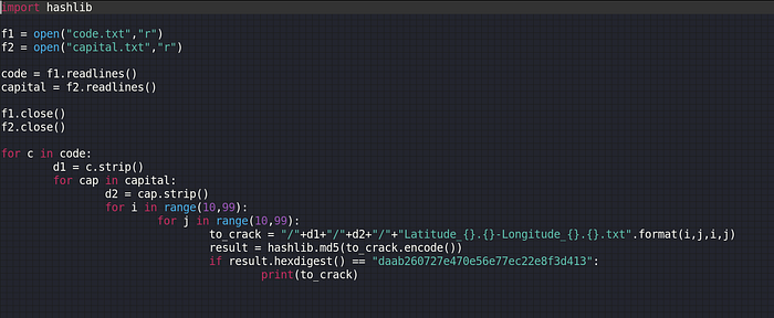 So try to find out anyways to get what was present there. use Way-back machine to get the file. As per our hint we got /iacon_code/(capital_of_country)/Latitude_{}.{}-Longitude_{}.{}.txt. So let make a wordlist with capital of all the countries.still we didn’t found the last thing Latitude_{}.{}-Longitude_{}.{}.txt. We need to find what will comes in the place of “{}” So let’s make a script to crack the hash