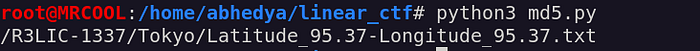 We already know the code,capital and decrypted message format. While decrypt the hash using the script we found a path R3LIC-1337/Tokyo/Latitude_95.37-Longitude_95.37.txt, contains our 1st flag and hint to the next flag