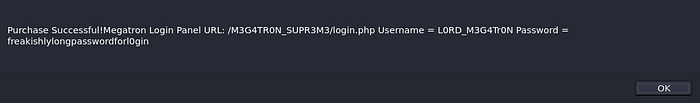 Purchase Successful!Megatron Login Panel URL: /M3G4TR0N_SUPR3M3/login.php Username = L0RD_M3G4Tr0N Password = freakishlylongpasswordforl0gin