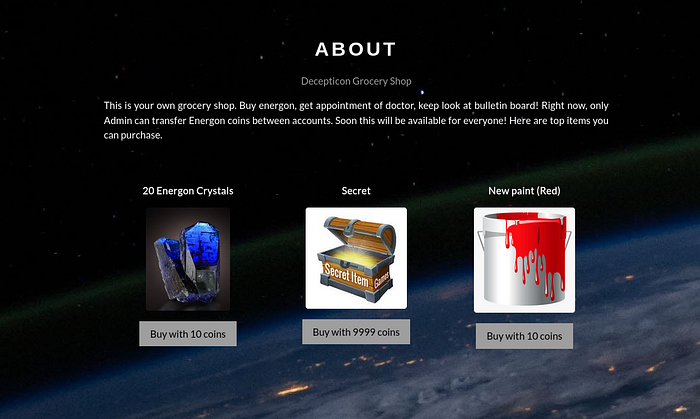 Okay try to buy the secret item but it said LOGIN FIRST, and it redirects you t to login panel. Using that create an account.After creating you’ll find dashboard. and try to buy the item again, but this time it returns “Not enough Coins”. So let’s try other methods, In dashboard we can find “Transfer Coins to a Friend in need?”, But It returns “Request cannot be entertained” all the time. In about section we can find another hint as “Only admin can transfer coins”. Note the money transfer URL