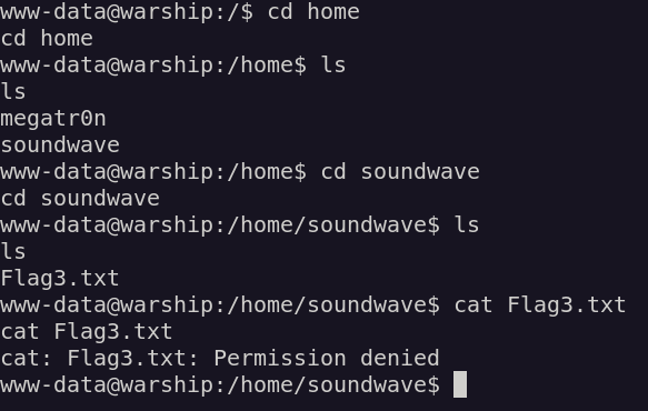 Check for the flag files. while checking the Home directory we found 2 folders named as megatr0n,soundwave. Check both the directories we found Flag3.txt file in soundwave directory. But the permission denied