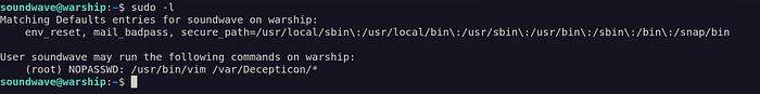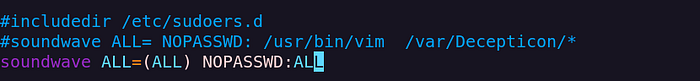soundwave ALL= NOPASSWD: /usr/bin/vim /var/Decepticon/*