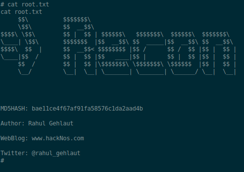 Thanks to Rahul Gehlaut for creating the VM and for Vulnhub for hosting it and all the other great VM’s on their site.