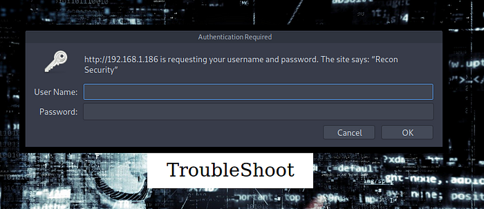 Thats a pretty hacker themed front page right there, haha. Looking at the source code there isnt much there, but if we click on the “TroubleShooting” link in the middle of the page it pops up a login window.
