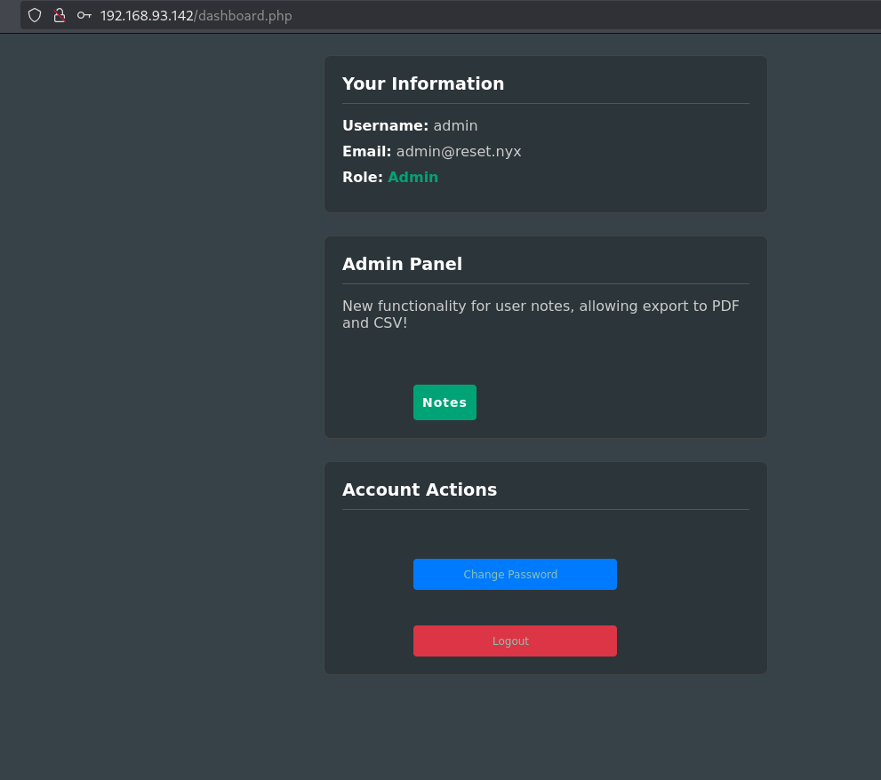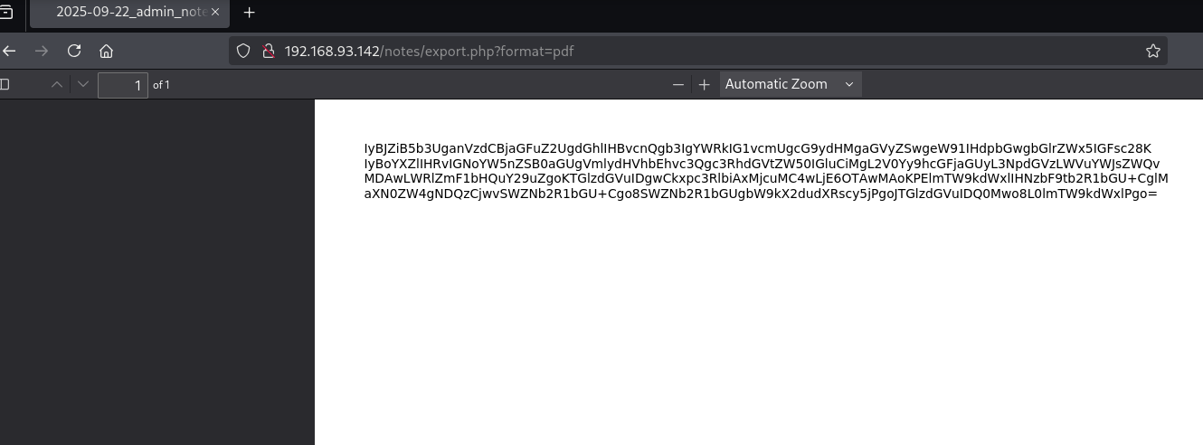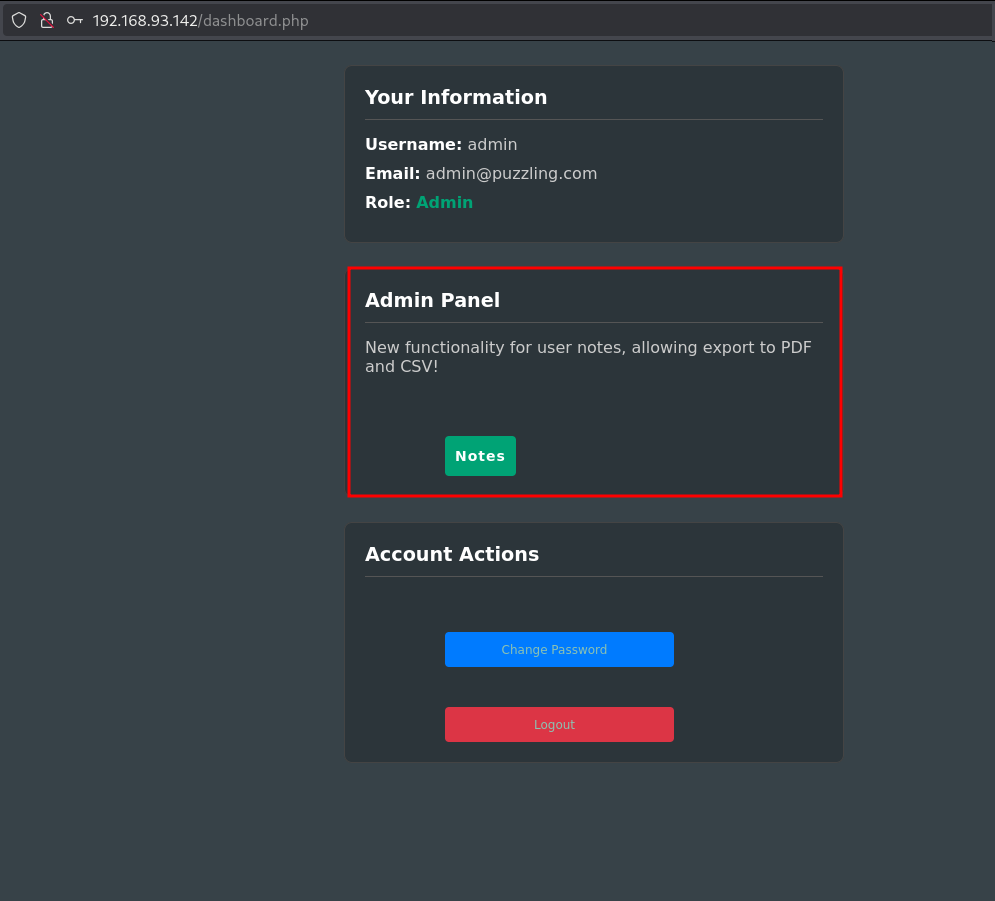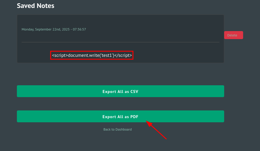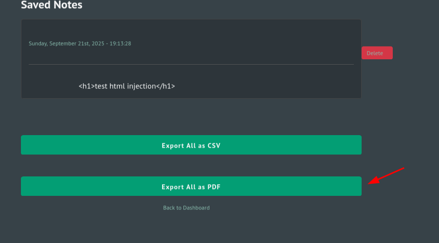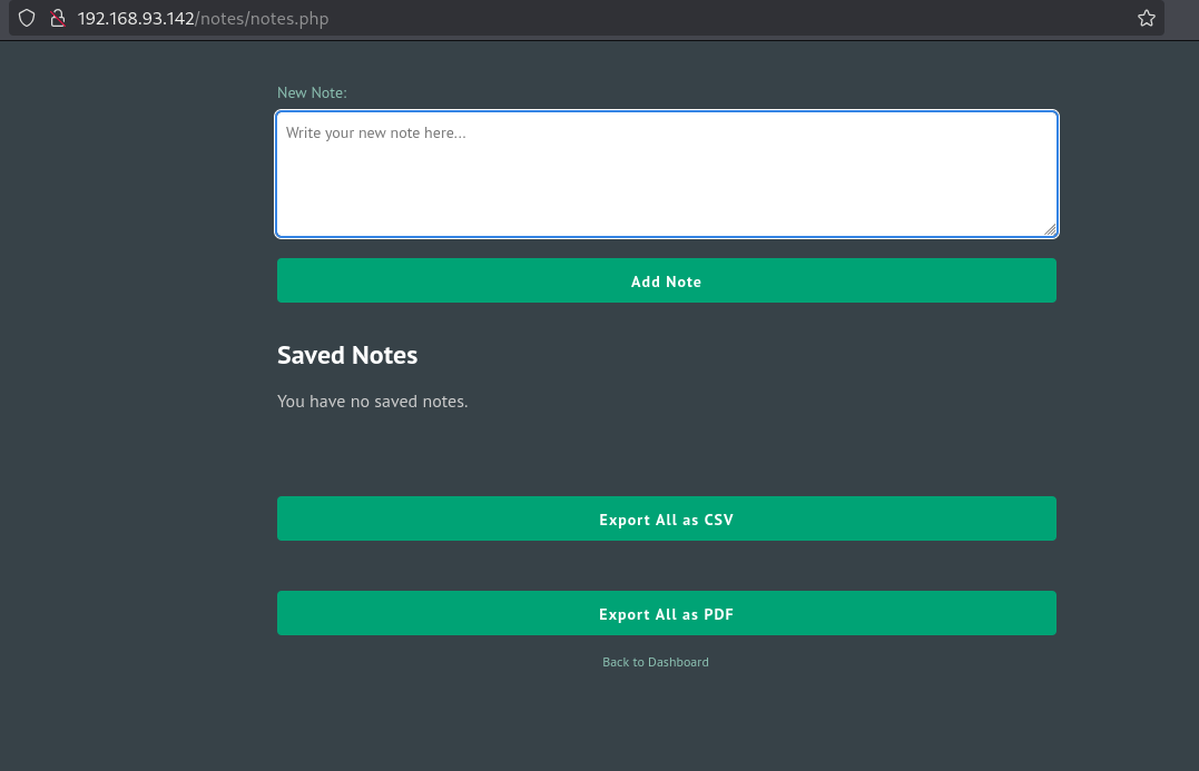 Como se ha podido observar en la última captura de pantalla, ya se ha obtenido acceso al panel con un usuario autenticado, específicamente con el usuario admin. Y se observa que hay una funcionalidad para crear notas la cual te permite explotar dichas notas en formato PDF o CSV.