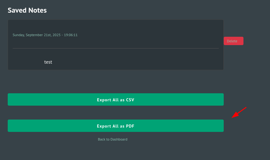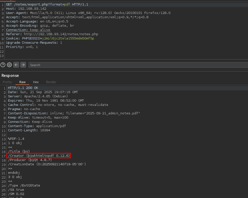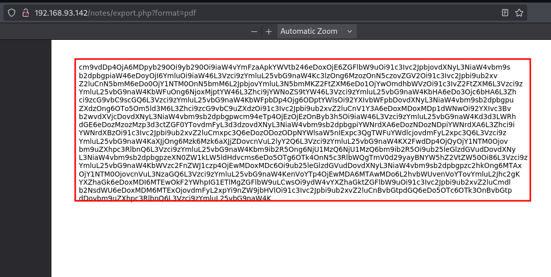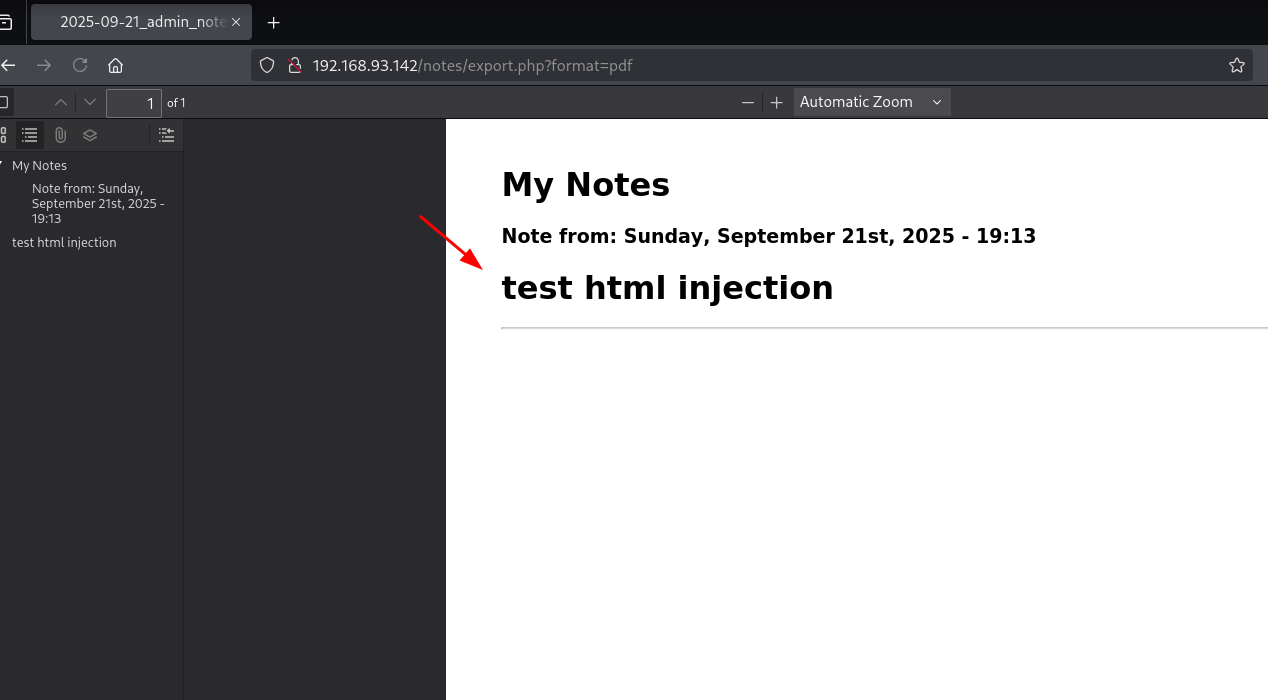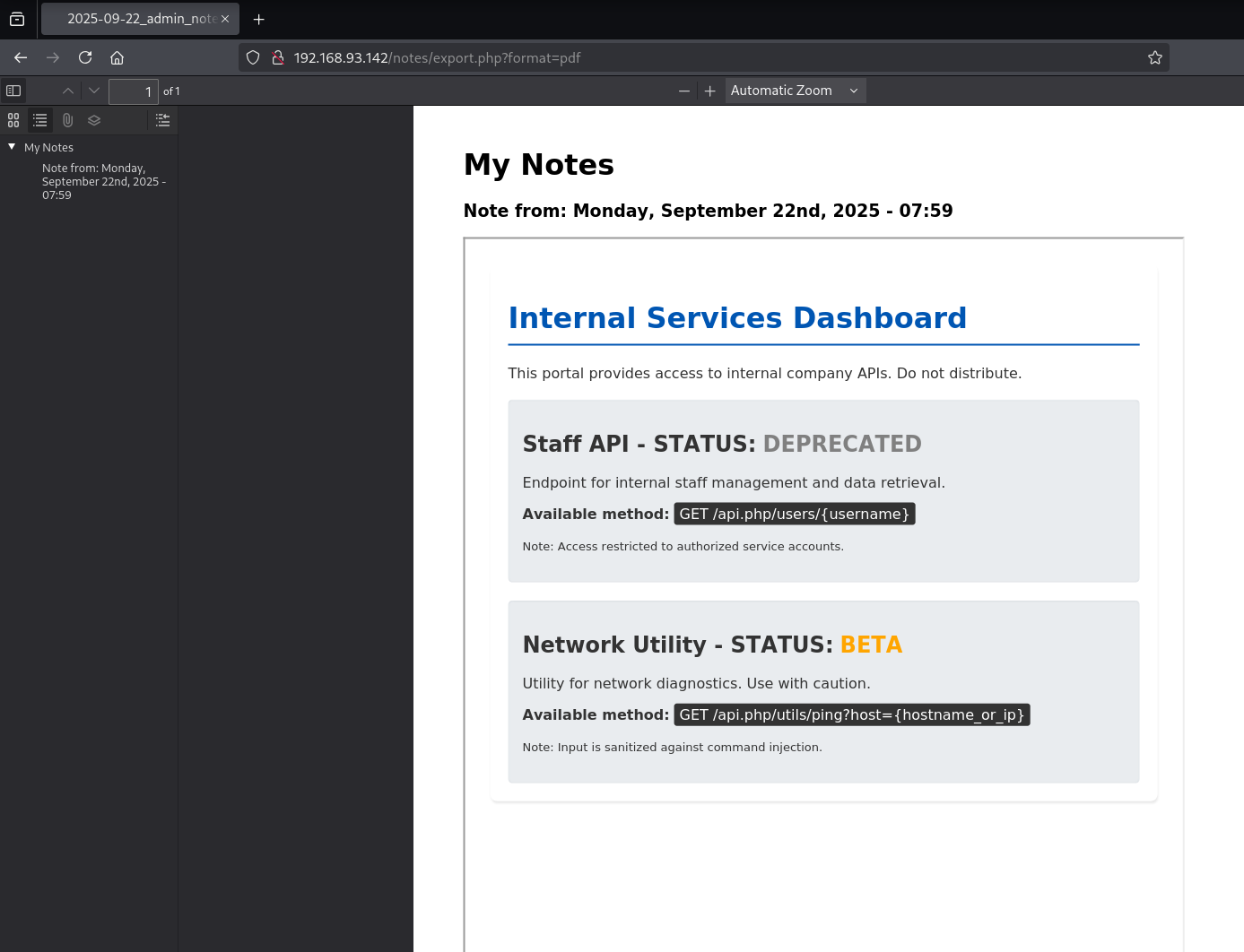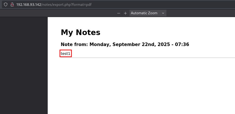 Como se ha podido observar en la última captura de pantalla, ya se ha obtenido acceso al panel con un usuario autenticado, específicamente con el usuario admin. Y se observa que hay una funcionalidad para crear notas la cual te permite explotar dichas notas en formato PDF o CSV.
