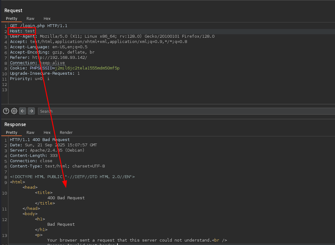 Como se puede observar en la siguiente captura, al cambiar el valor de la cabecera Host a test, esta falla dando un error 400 Bad Request: