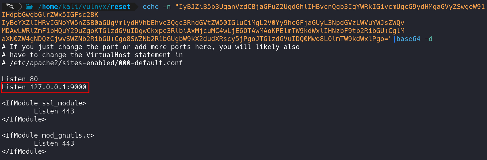 Uno de los checks que suelo probar cuando estoy ante este tipo de situaciones, es comprobar si hay puertos internos en el aplicativo web, ya que si los hay, se puede intentar interactuar con dicho aplicativo. Para ello primero hay que recordar que lo más normal para comprobar hacer esto, es necesario por ejemplo un SSRF para hacer un fuzzing de los puertos internos, pero aún hay una carta más sobre la manga, y es que si sabemos la tecnología que hay corriendo por detrás, hay archivos del sistema que nos pueden decir si hay un puerto interno o no, estamos ante un Apache, así que sería comprobar si en el archivo /etc/apache2/ports.conf hay algún puerto más a parte del 80. Si fuera un nginx la ruta sería /etc/nginx/sites-enabled/default.