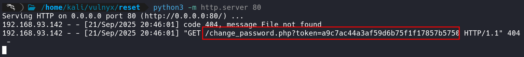 Tras un momento esperando se recibe como el usuario admin ha hecho clic sobre el enlace que apunta a nuestra IP y nos ha hecho la solicitud a nuestro servidor, mostrando el token necesario para cambiar la contraseña:
