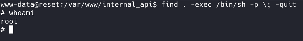 Let's get down to business, since the fun part is over... we're dealing with a very simple escalation where, by using the command to search for SUID binaries, we find that the `find` binary has the necessary permissions, thus allowing us to escalate directly to root: