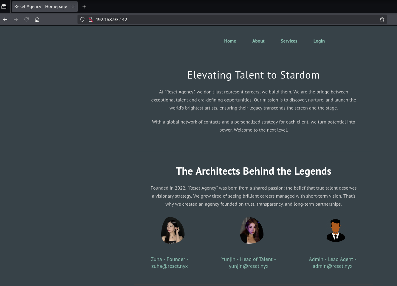 At first glance, it appears to be a talent agency website; several email addresses can already be listed, which will be important once we have fuzzed the web application.