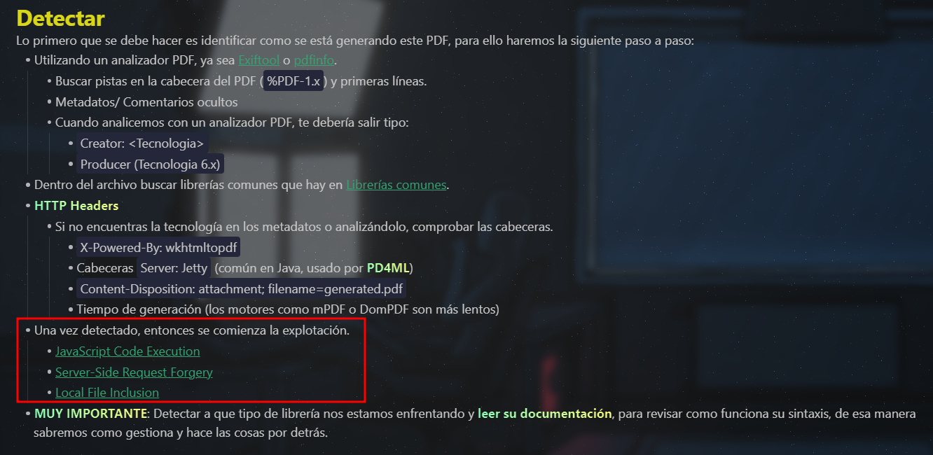 Cuando nos enfrentamos a generadores de PDF, por lo general están bien configurados y no son vulnerables, pero pueden haber errores de configuración o que la versión del software que se está utilizando esta obsoleta. Eso abre la puerta a que vulnerabilidades como HTML Injection, Server-Side JavaScript Injection, Server-Side Request Forgery y Local File Inclusion. En este caso nos estaremos enfrentando a un mix de todas ellas.