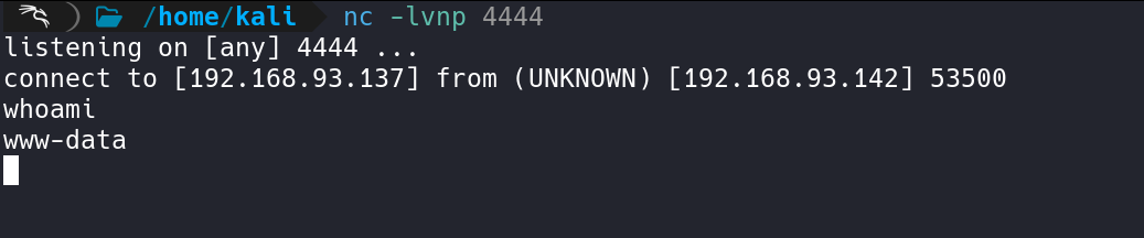 Now that we know the operator is `/` |, we need to check which commands are possible and which aren't. Initially, `whoami` isn't on the blacklist. In this case, for future reference, we want to use `busybox` to obtain the reverse shell.