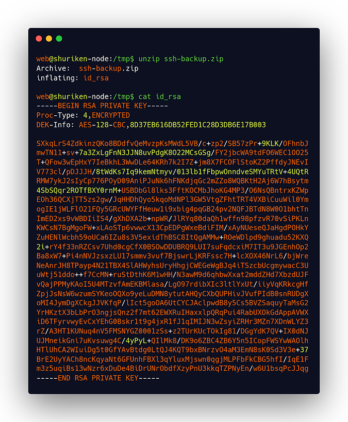 We can notice that there is passwd.bak and shadow.bak along with ssh-backup.zip. Unfortunately, passwd and shadow file are not readable by the user which we have shell. So, I copied that ssh-backup.zip into /tmp directory and unzipped it.
