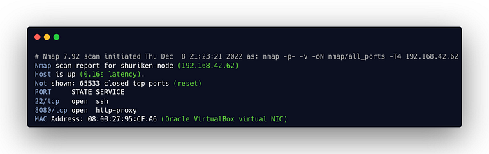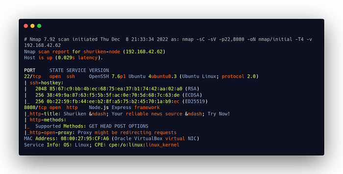 From the above screenshot, we can take a note of ports open, 22 and 8080. 22 is SSH and 8080 is running a node application. Then I began with nmap default script scan.