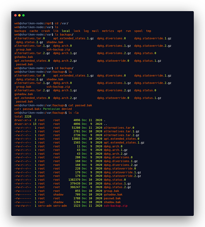Good, we have shell now and let’s begin with enumerating the entire system. So firstly, I went to check if there are backups file available.